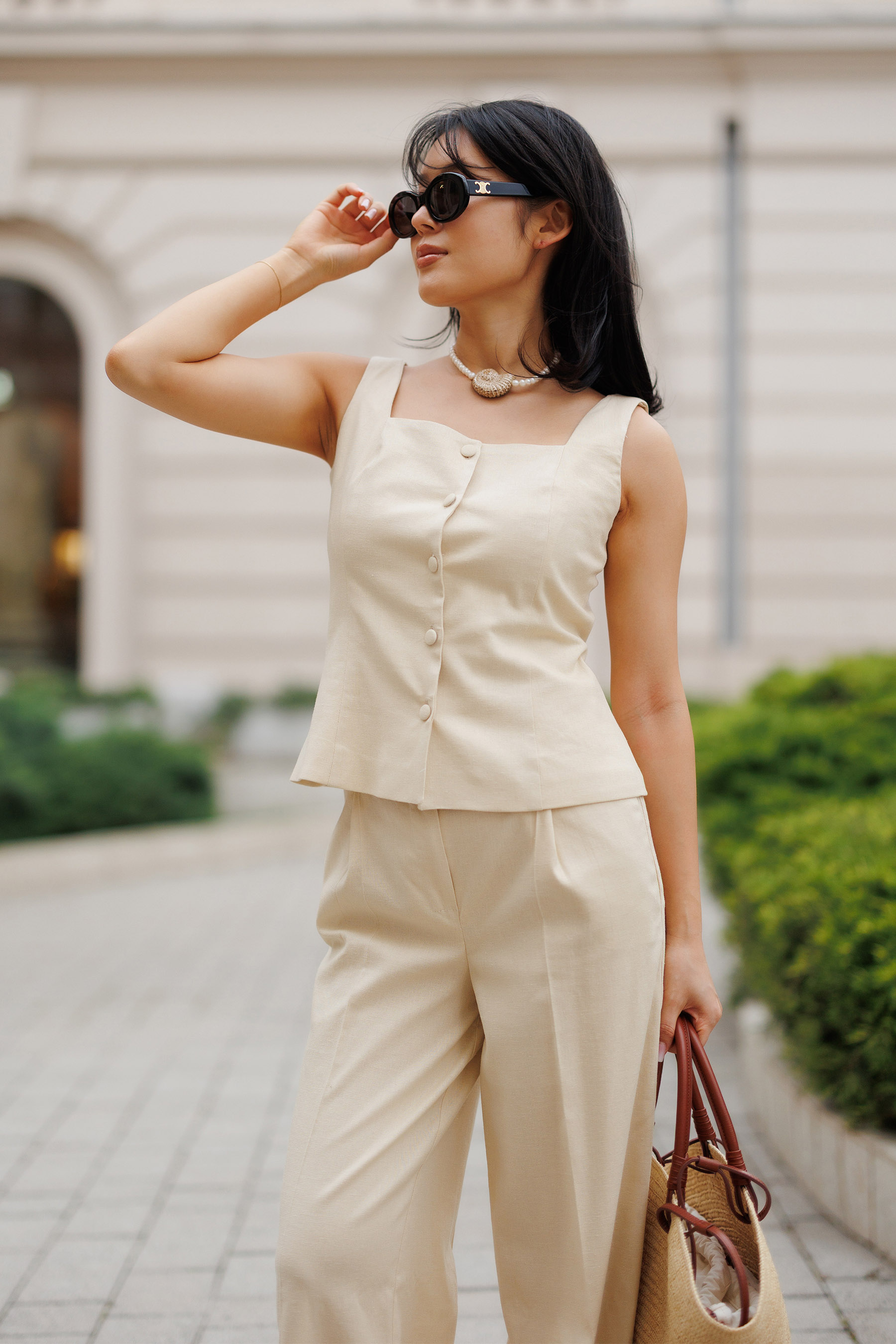 Pantaloni eleganți din in cu talie înaltă, pense în față și dungă distinctă emană rafinament și stil.